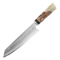The knife features a unique resin, tree durian, turquoise, and flower nail handle that not only offers a comfortable and ergonomic grip but also adds a touch of elegance and sophistication to your kitchen. The resin material ensures a sturdy and durable handle, while the tree durian and turquoise elements provide a beautiful and distinctive design that stands out in any kitchen.